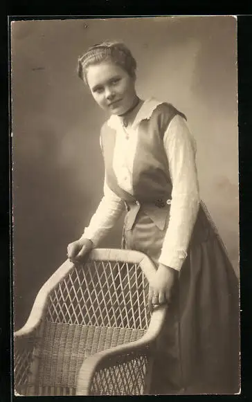 Foto-AK Junge Dame steht an einem Korbstuhl
