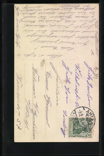 Personenbezogene Daten auf der Rückseite der Karte wurden durch blauen Textmarker unkenntlich gemacht. Die blauen Stellen sind auf die Vorderseite durchgeweicht und wirken sich negativ auf das Postkartenfoto aus