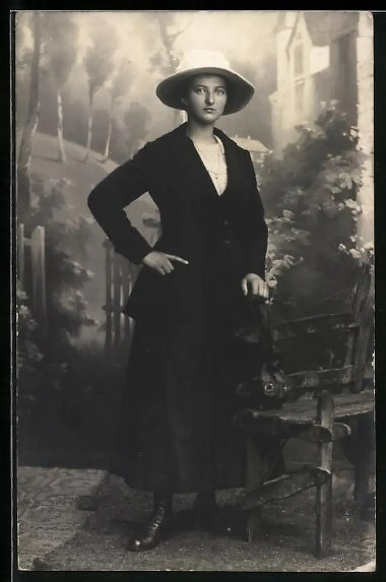 Foto-AK Junge Frau an einer Bank in einer Studiokulisse