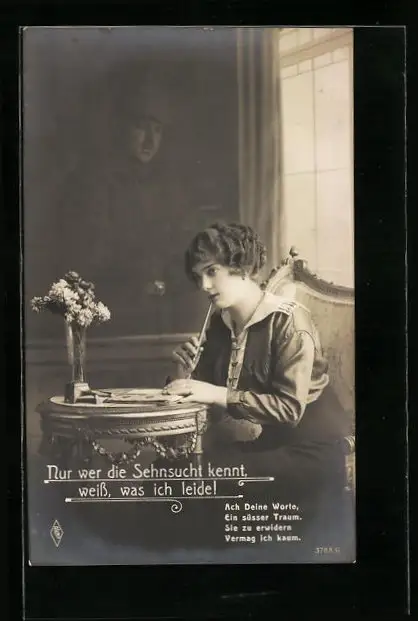 Foto-AK Junge Frau denkt an ihren Liebsten im Felde