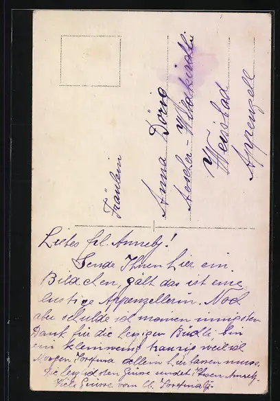 Personenbezogene Daten auf der Rückseite der Karte wurden durch blauen Textmarker unkenntlich gemacht. Die blauen Stellen sind auf die Vorderseite durchgeweicht und wirken sich negativ auf das Postkartenfoto aus