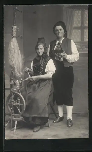 Foto-AK Junge Frau und Mann in Tracht mit Spinnrad