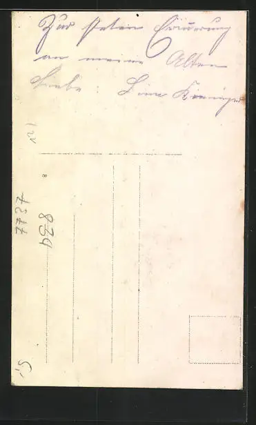 Personenbezogene Daten auf der Rückseite der Karte wurden durch blauen Textmarker unkenntlich gemacht. Die blauen Stellen sind auf die Vorderseite durchgeweicht und wirken sich negativ auf das Postkartenfoto aus