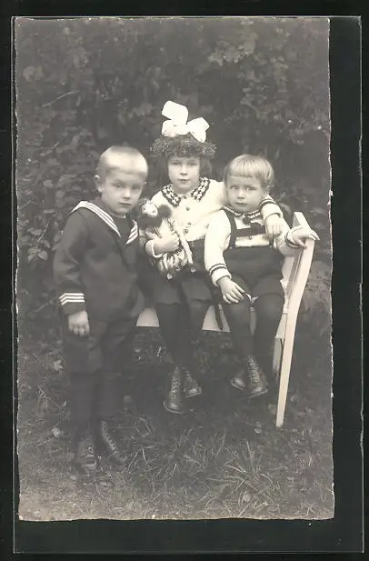 Foto-AK Junge in Matroseanzug und Mädchen mit Puppe