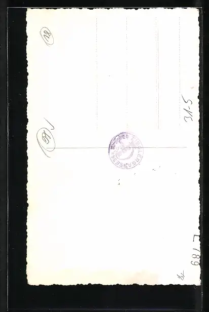 Personenbezogene Daten auf der Rückseite der Karte wurden durch blauen Textmarker unkenntlich gemacht. Die blauen Stellen sind auf die Vorderseite durchgeweicht und wirken sich negativ auf das Postkartenfoto aus