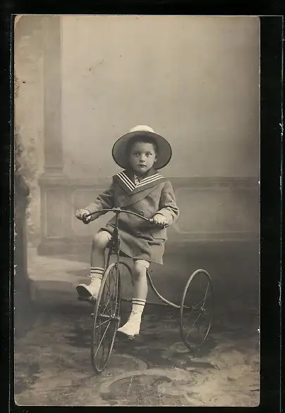 Foto-AK Kind im Matrosenanzug auf einem Dreirad