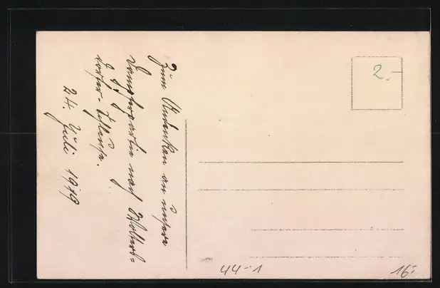 Personenbezogene Daten auf der Rückseite der Karte wurden durch blauen Textmarker unkenntlich gemacht. Die blauen Stellen sind auf die Vorderseite durchgeweicht und wirken sich negativ auf das Postkartenfoto aus