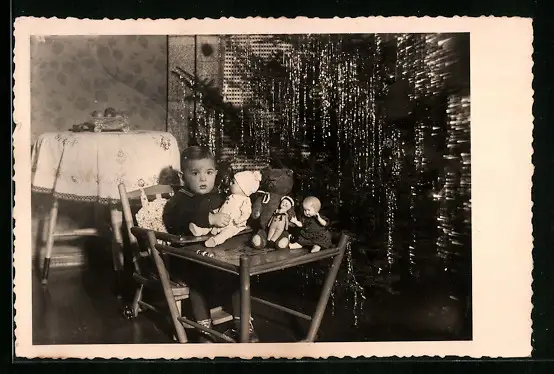 Foto-AK Kleiner Junge mit Puppen und einem Teddy