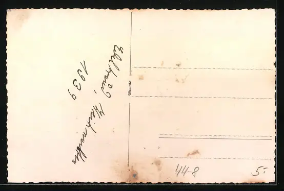 Personenbezogene Daten auf der Rückseite der Karte wurden durch blauen Textmarker unkenntlich gemacht. Die blauen Stellen sind auf die Vorderseite durchgeweicht und wirken sich negativ auf das Postkartenfoto aus