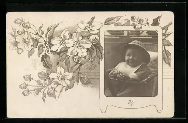Foto-AK Kleines Kind mit einem Hut, Blumenzweig, Passepartout