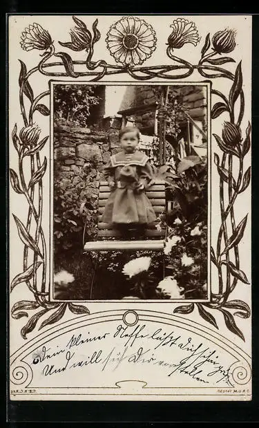 Foto-AK Kleines Mädchen auf einem Stuhl stehend, Blumenmotiv