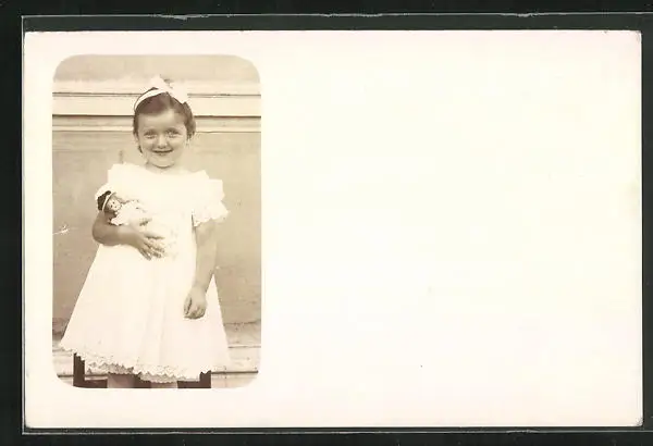 Foto-AK Kleines Mädchen im Kleid mit Puppe im Arm