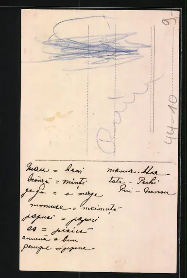 Personenbezogene Daten auf der Rückseite der Karte wurden durch blauen Textmarker unkenntlich gemacht. Die blauen Stellen sind auf die Vorderseite durchgeweicht und wirken sich negativ auf das Postkartenfoto aus
