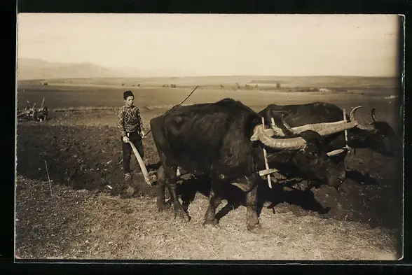 Foto-AK Knabe bei der Feldarbeit mit Ochsen-Gespann