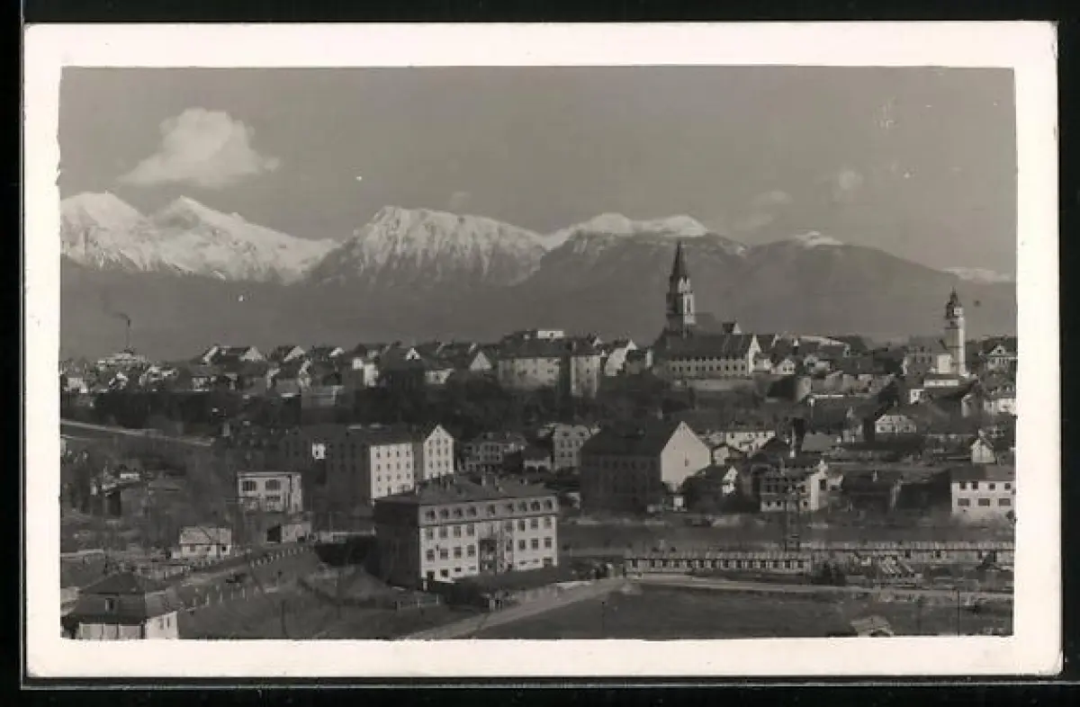 Foto-AK Krainburg, Ortsansicht mit Kirche und Berglandschaft