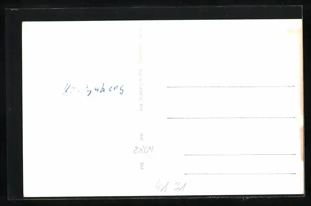 Personenbezogene Daten auf der Rückseite der Karte wurden durch blauen Textmarker unkenntlich gemacht. Die blauen Stellen sind auf die Vorderseite durchgeweicht und wirken sich negativ auf das Postkartenfoto aus