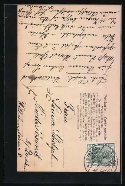 Personenbezogene Daten auf der Rückseite der Karte wurden durch blauen Textmarker unkenntlich gemacht. Die blauen Stellen sind auf die Vorderseite durchgeweicht und wirken sich negativ auf das Postkartenfoto aus