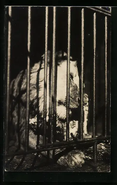 Foto-AK Löwe hinter Gittern im gleissenden Licht