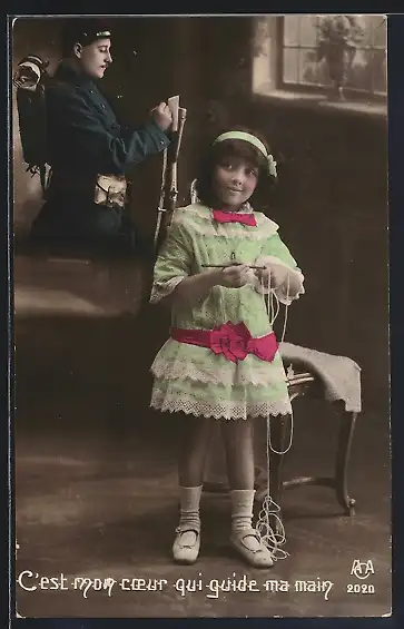 Foto-AK Mädchen denkt an ihren Vater an der Front