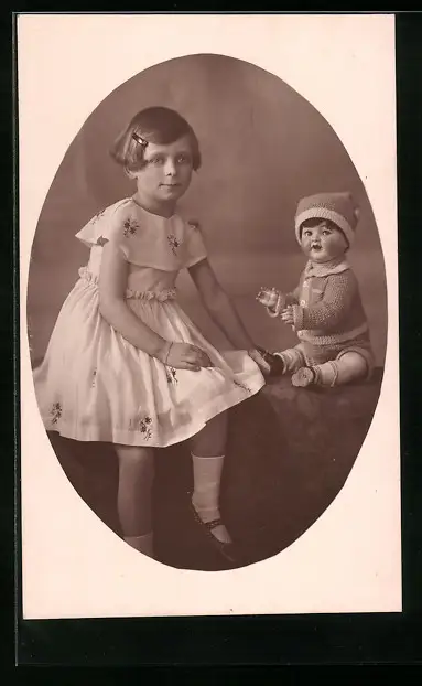 Foto-AK Mädchen im Kleid mit seiner Puppe