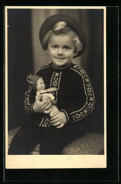 Foto-AK Mädchen mit Hut und Puppe