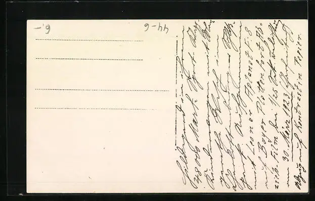 Personenbezogene Daten auf der Rückseite der Karte wurden durch blauen Textmarker unkenntlich gemacht. Die blauen Stellen sind auf die Vorderseite durchgeweicht und wirken sich negativ auf das Postkartenfoto aus