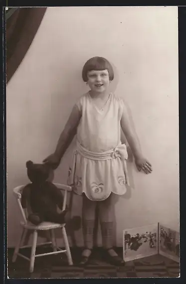 Foto-AK Mädchen mit Teddy und Bilderbuch