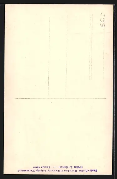 Personenbezogene Daten auf der Rückseite der Karte wurden durch blauen Textmarker unkenntlich gemacht. Die blauen Stellen sind auf die Vorderseite durchgeweicht und wirken sich negativ auf das Postkartenfoto aus