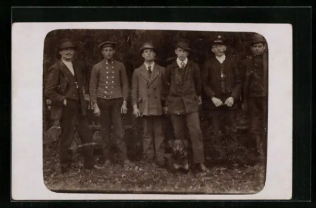Foto-AK Männergruppe mit einem Hund