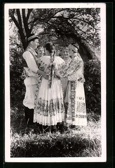 Foto-AK Mann und vier Frauen in Tracht im Kreis