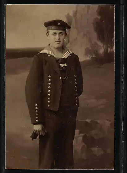 Foto-AK Matrose in Uniform, Mützenband Minen-Abteilung