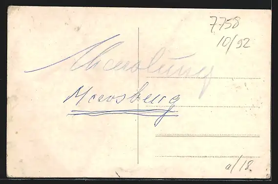 Personenbezogene Daten auf der Rückseite der Karte wurden durch blauen Textmarker unkenntlich gemacht. Die blauen Stellen sind auf die Vorderseite durchgeweicht und wirken sich negativ auf das Postkartenfoto aus