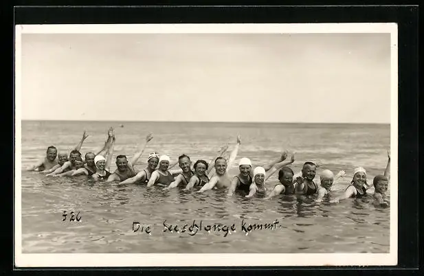 Foto-AK Menschen bilden im Meer eine Seeschlange, Bademode