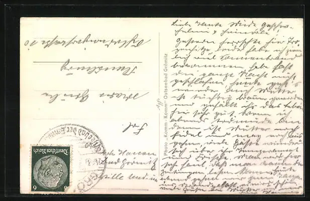 Personenbezogene Daten auf der Rückseite der Karte wurden durch blauen Textmarker unkenntlich gemacht. Die blauen Stellen sind auf die Vorderseite durchgeweicht und wirken sich negativ auf das Postkartenfoto aus