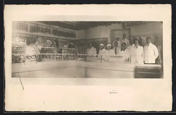 Foto-AK Mitarbeiter im Feinkost-Geschäft, Fleischerei