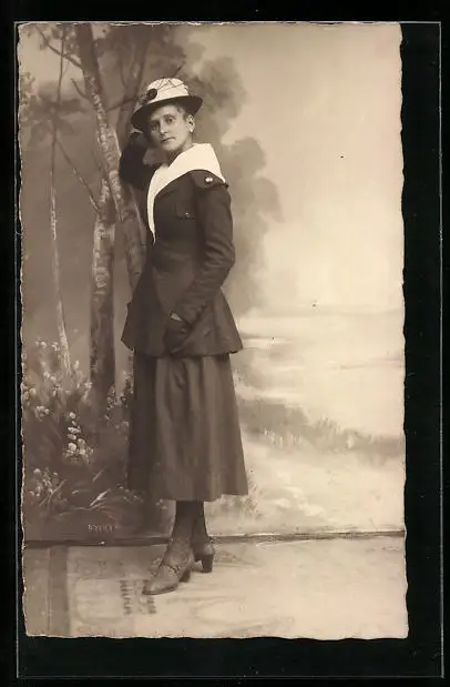 Foto-AK Modisch gekleidete Frau in einer Studiokulisse