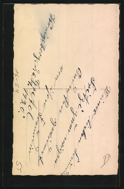 Personenbezogene Daten auf der Rückseite der Karte wurden durch blauen Textmarker unkenntlich gemacht. Die blauen Stellen sind auf die Vorderseite durchgeweicht und wirken sich negativ auf das Postkartenfoto aus
