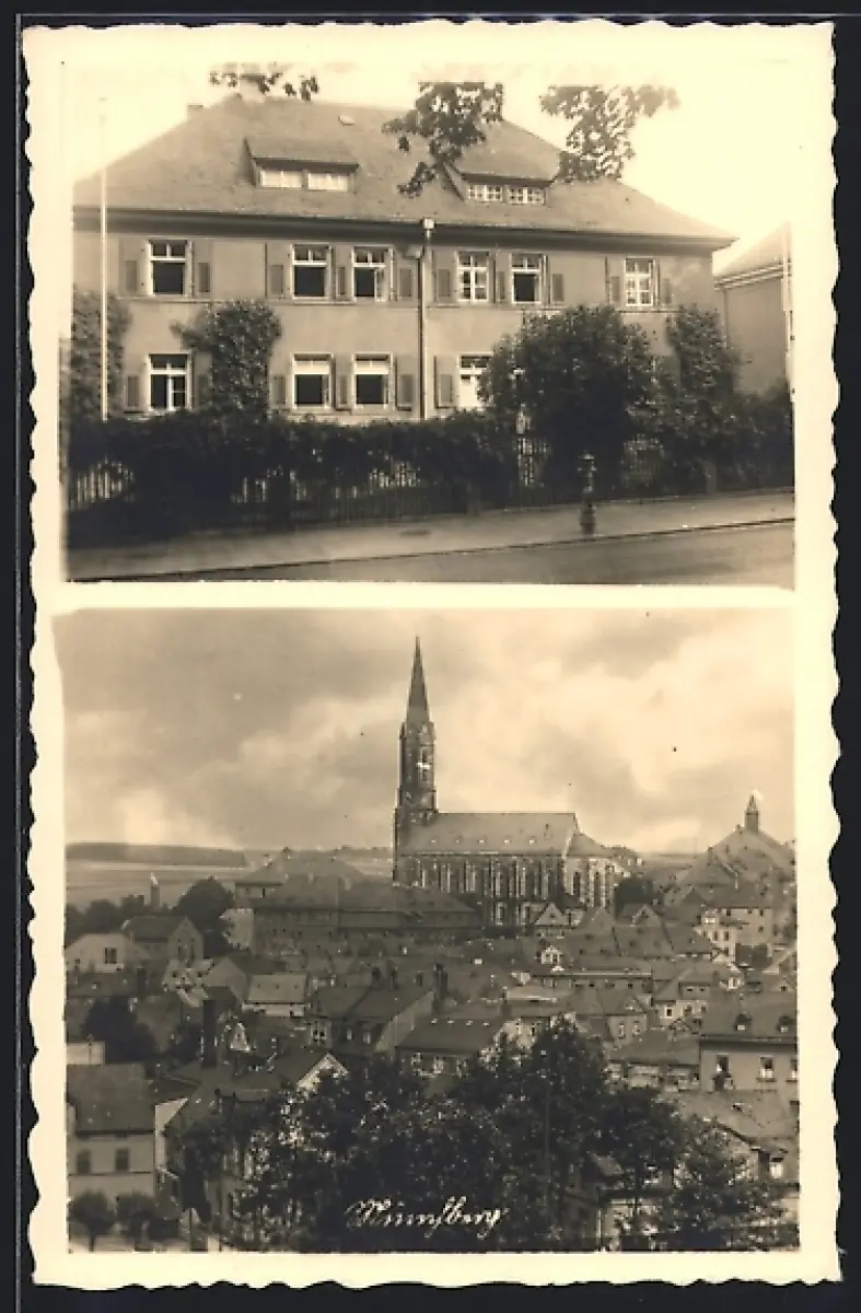 Foto-AK Münchberg, Ortsansicht mit Kirche, Zwei-Etagen-Wohnhaus