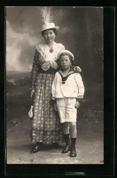 Foto-AK Mutter mit Federhut neben ihrem Sohn im Matrosenanzug in Studiokulisse