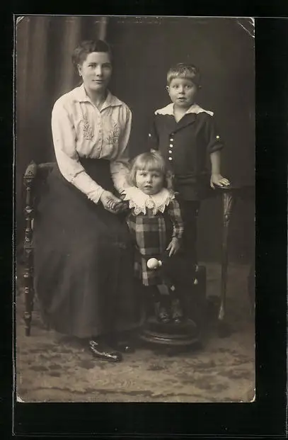 Foto-AK Mutter mit Kindern und Spielzeug-Puppe