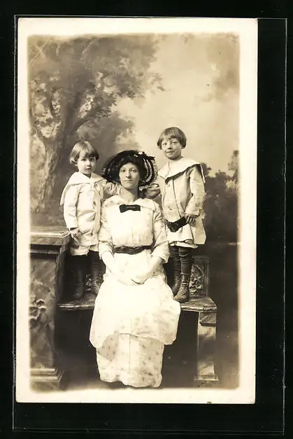 Foto-AK Mutter neben ihren Kindern in Studiokulisse