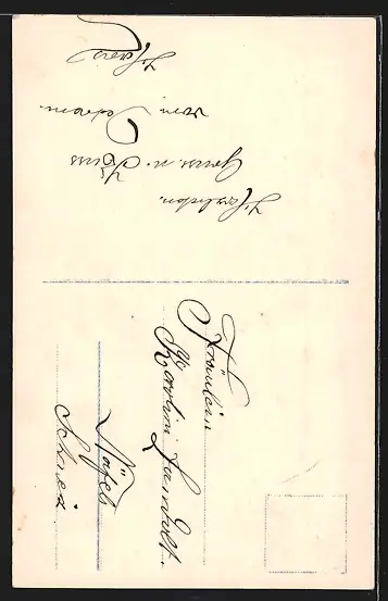 Personenbezogene Daten auf der Rückseite der Karte wurden durch blauen Textmarker unkenntlich gemacht. Die blauen Stellen sind auf die Vorderseite durchgeweicht und wirken sich negativ auf das Postkartenfoto aus