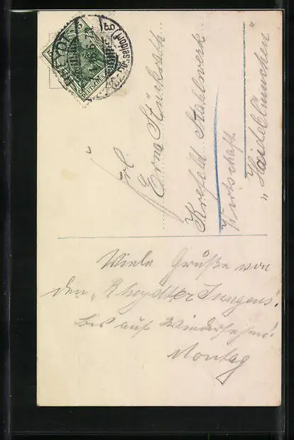 Personenbezogene Daten auf der Rückseite der Karte wurden durch blauen Textmarker unkenntlich gemacht. Die blauen Stellen sind auf die Vorderseite durchgeweicht und wirken sich negativ auf das Postkartenfoto aus