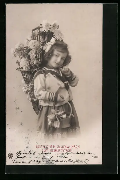 Foto-AK NPG Nr. 3502: Mädchen im Matrosenkleid mit Blumenkörben