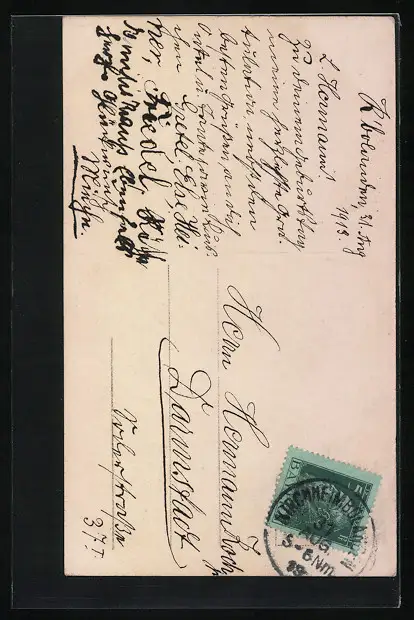 Personenbezogene Daten auf der Rückseite der Karte wurden durch blauen Textmarker unkenntlich gemacht. Die blauen Stellen sind auf die Vorderseite durchgeweicht und wirken sich negativ auf das Postkartenfoto aus
