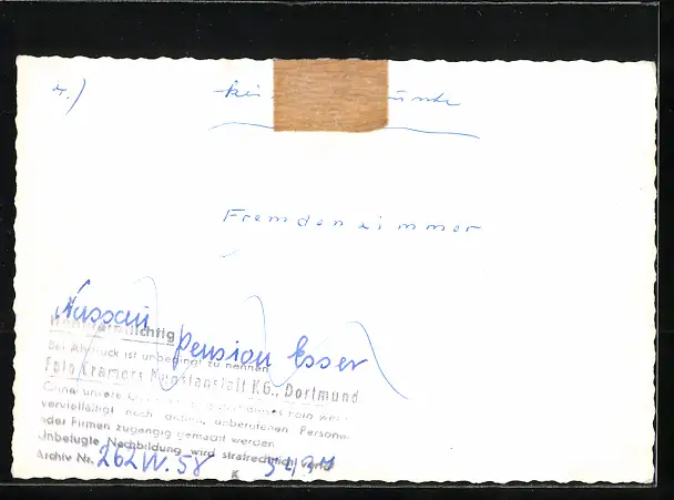 Personenbezogene Daten auf der Rückseite der Karte wurden durch blauen Textmarker unkenntlich gemacht. Die blauen Stellen sind auf die Vorderseite durchgeweicht und wirken sich negativ auf das Postkartenfoto aus