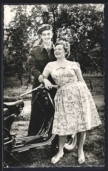Foto-AK Niederländischer Soldat mit Vespa Motorroller und Liebster