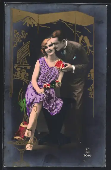Foto-AK P. C. Paris: Herr verführt Dame mit Rosen