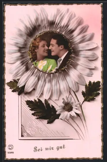 Foto-AK P. C. Paris: Liebespaar lächelt sich an, Blumenmotiv