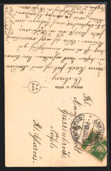 Personenbezogene Daten auf der Rückseite der Karte wurden durch blauen Textmarker unkenntlich gemacht. Die blauen Stellen sind auf die Vorderseite durchgeweicht und wirken sich negativ auf das Postkartenfoto aus